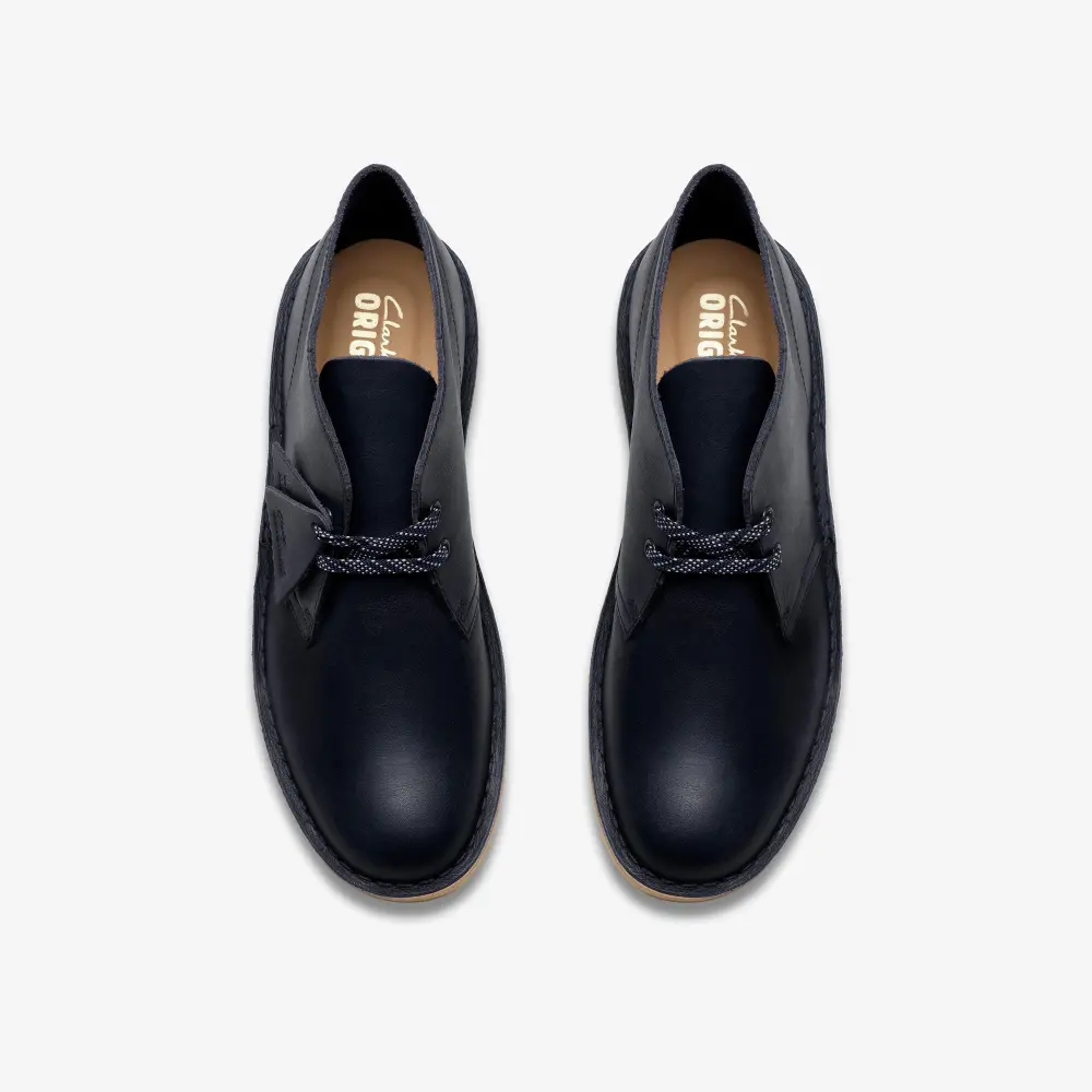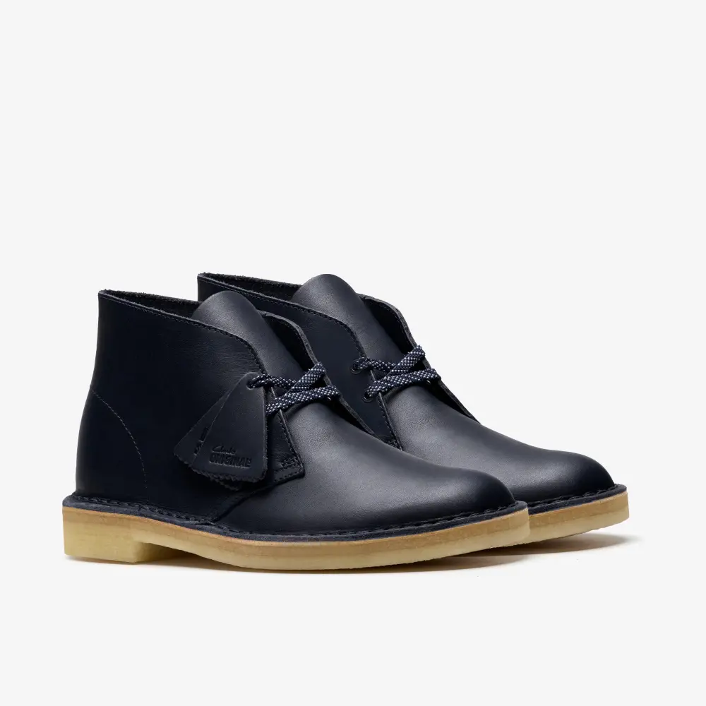 Cultural cachet and design DNA: no shoe is quite like the Clarks Originals Desert Boot. Born in the '50s, its minimal, progressive style sparked a worldwide footwear revolution. And every design detail today remains true to that first pioneering pair. Here, the boot’s crafted, clean lines are enhanced with premium navy leather and finished with an unfussy lace fastening. The authentic crepe sole completes this distinctive silhouette. Instantly recognizable, forever iconic. A true original.
