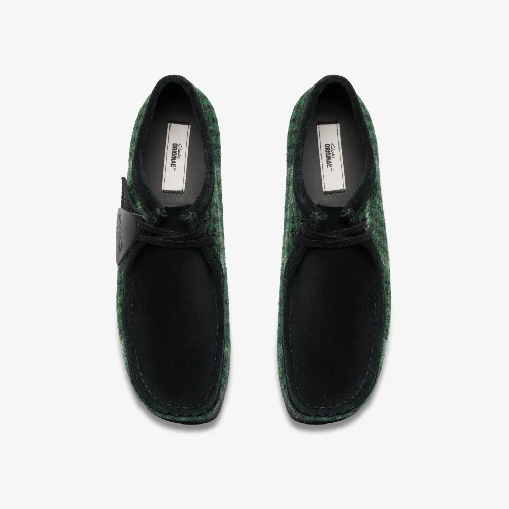 This unique version of the classic Wallabee™ features striking green Harris Tweed on the quarter panels, paired with suede on the vamp, collar, and apron binding, offering a tactile contrast of textures.