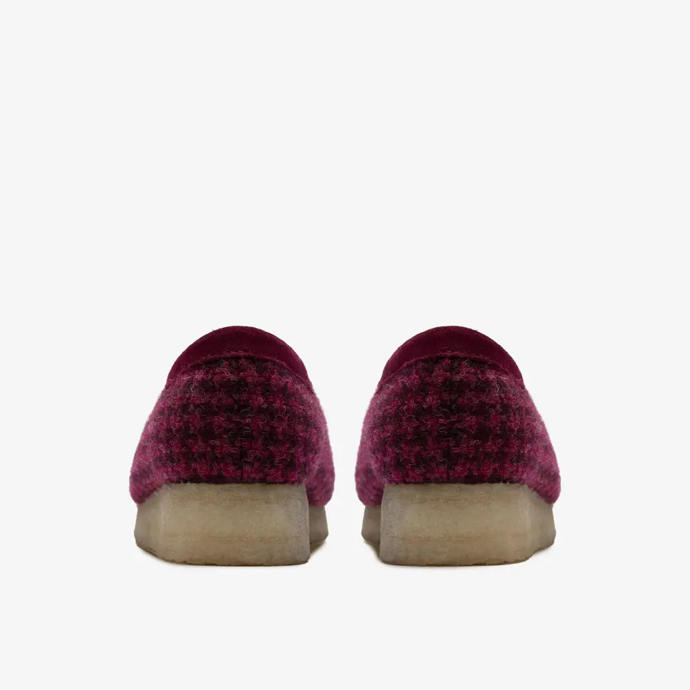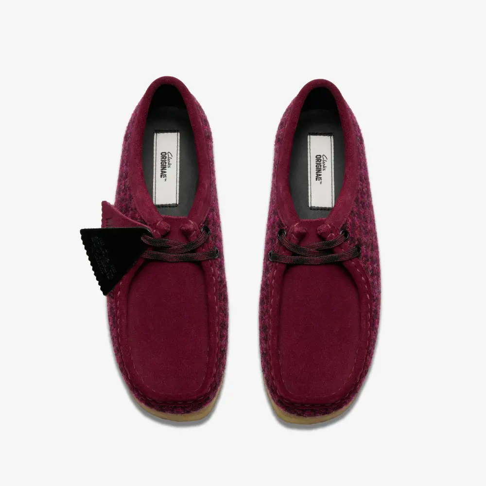 Introducing the Clarks Wallabee™ Harris Tweed Pack, an eye-catching combination of premium materials and classic design. This edition features a bold purple Harris Tweed on the quarter panels, complemented by luxurious purple suede on the vamp, collar, and apron binding, creating an eye-catching texture contrast.